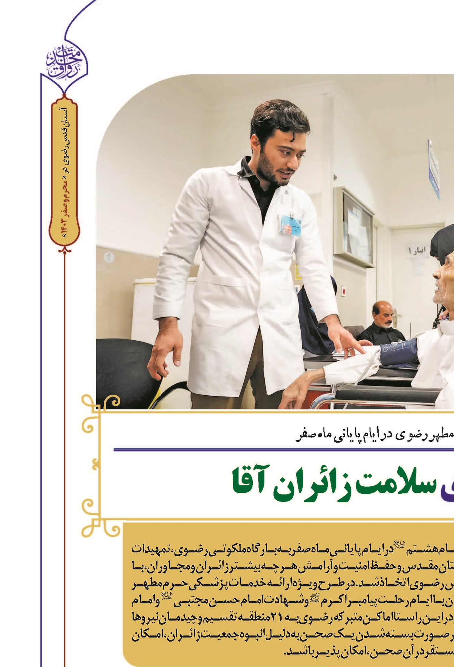 با توجه به تشرف گسترده و میلیونی محبان امام هشتم (ع) در ایام پایانی ماه صفر به بارگاه ملکوتی رضوی، تمهیدات ویژهای برای ارتقای خدمات درمانی این آستان مقدس و حفظ امنیت و آرامش هر چه بیشتر زائران و مجاوران، با همکاری نهادهای ذیربط توسط آستان قدس رضوی اتخاذ شد. در طرح ویژه ارائه خدمات پزشکی حرم مطهر رضوی در ایام پایانی ماه صفر امسال، همزمان با ایام رحلت پیامبر اکرم (ص) و شهادت امام حسن مجتبی (ع) و امام رضا (ع) بهعنوان ایام پیک در نظر گرفته شد و در این راستا اماکن متبرکه رضوی به ۲۱ منطقه تقسیم و چیدمان نیروها و امکانات نیز بهگونهای برنامهریزی شد که در صورت بسته شدن یک صحن بهدلیل انبوه جمعیت زائران، امکان ارائه خدمات پزشکی اورژانسی با نیروهای مستقر در آن صحن، امکانپذیر باشد.