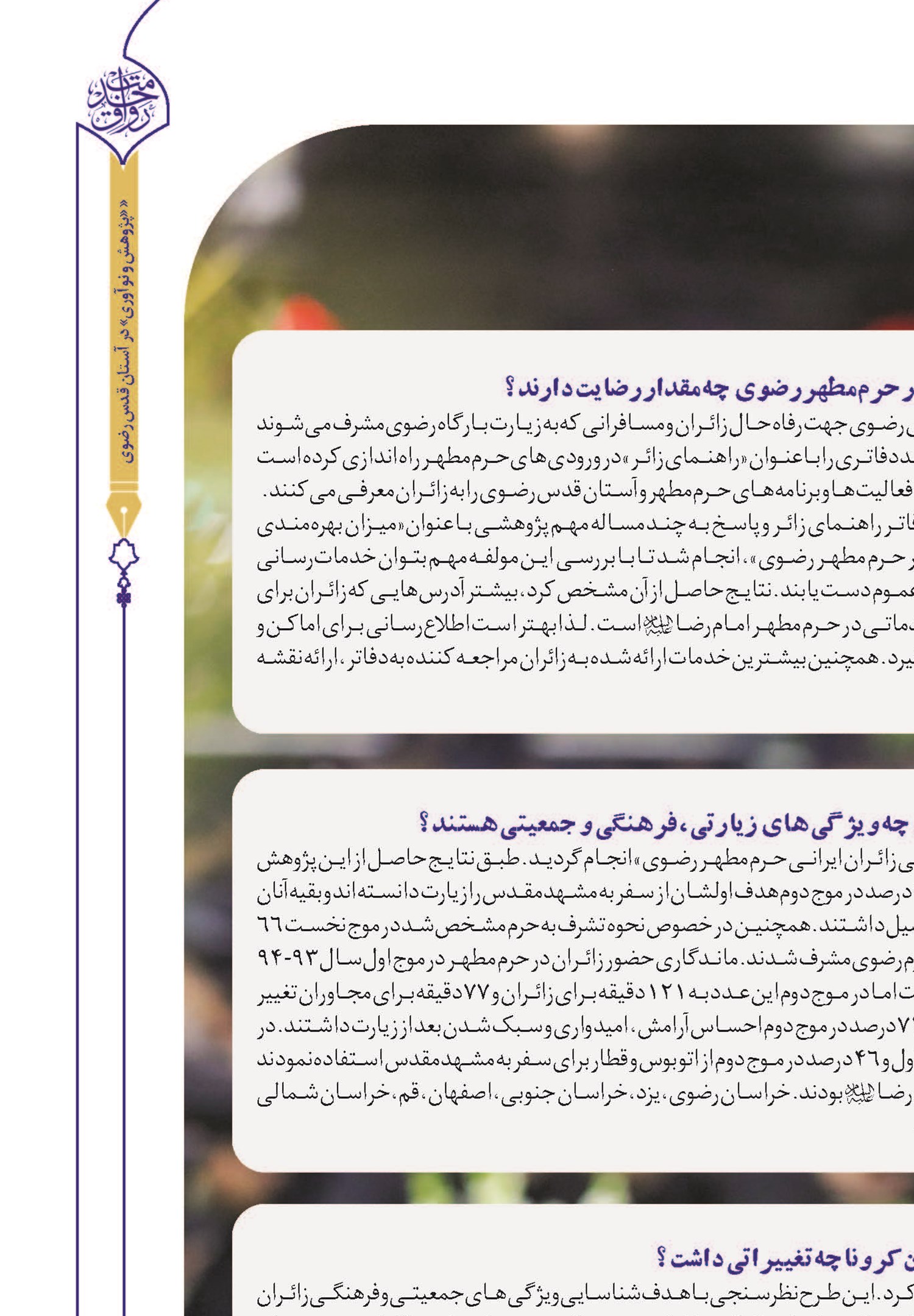 شیوع کرونا، تغییرات عمدهای در رفتارهای زیارتی ایجاد کرد. این طرح نظرسنجی با هدف شناسایی ویژگیهای جمعیتی و فرهنگی زائران و بررسی تأثیر همهگیری کرونا بر رفتار زیارتی آنان انجام شد. یافتههای این تحقیق نشان میدهد که مدتزمان حضور زائران در حرم بهطور محسوسی کاهش یافته است. طبق این تحقیق میزان تشرف کمتر از سی دقیقه در سال ۹۹ به طور چشمگیری افزایش داشته است که این تغییر عمدتاً به دلیل نگرانیهای بهداشتی و رعایت پروتکلهای فاصلهگذاری اجتماعی بوده است. یکی دیگر از نتایج مهم این پژوهش، تغییر در ترکیب جغرافیایی زائران بود. در سال ۱۳۹۹، زائران محلی از استان خراسان رضوی سهم بیشتری از جمعیت را تشکیل دادند. این موضوع نشاندهنده تأثیر محدودیتهای سفر و نگرانیهای ناشی از کرونا بر کاهش حضور زائران غیرمحلی است. کاهش مدتزمان حضور، تغییر در ترکیب سنی و جغرافیایی زائران و کاهش مشارکت در برنامههای مذهبی از مهمترین نتایج این تحقیق است. آستان قدس رضوی میتواند با اتخاذ سیاستهای جدید، خدمات خود را متناسب با شرایط بهداشتی و انتظارات زائران محلی بهبود بخشد.