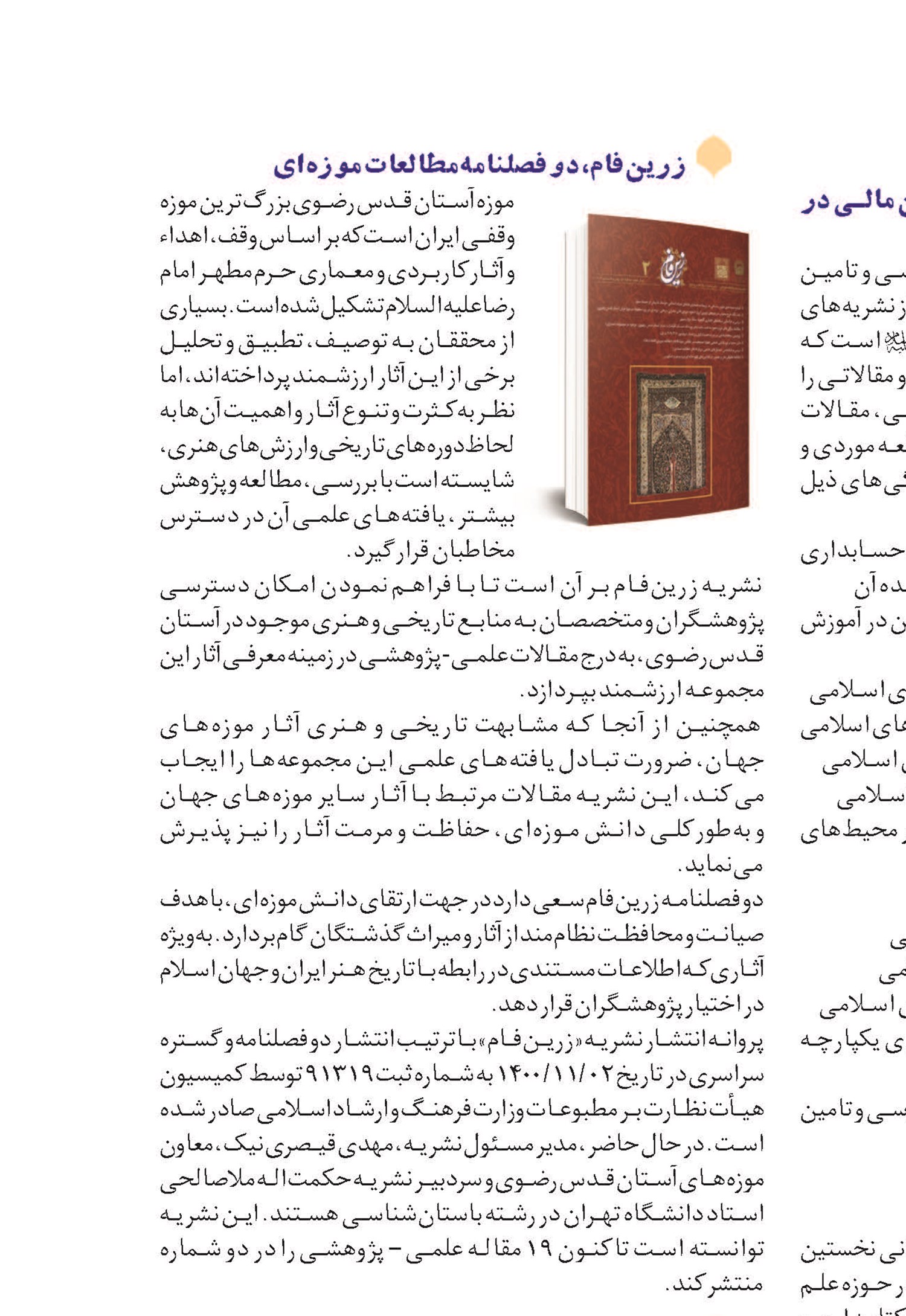 نشریه زرین فام بر آن است تا با فراهم نمودن امکان دسترسی پژوهشگران و متخصصان به منابع تاریخی و هنری موجود در آستان قدس رضوی، به درج مقالات علمی-پژوهشی در زمینه معرفی آثار این مجموعه ارزشمند بپردازد.